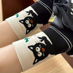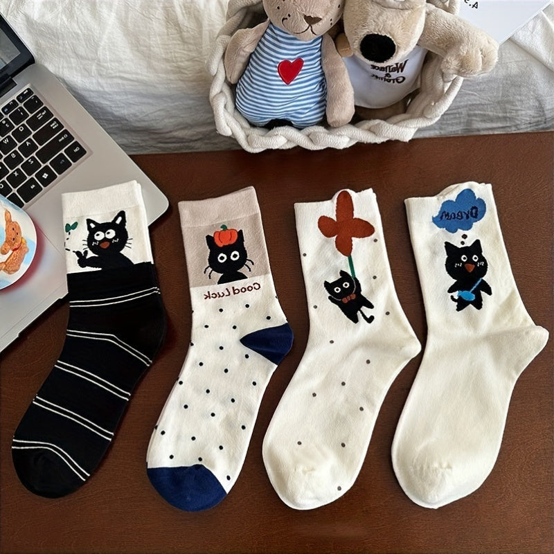 4 Pairs Cartoon Cat Mid Calf Socks, 97% Polyester 3% Spandex, Knit Fabric, Animal Pattern, 280g/m², Hand Wash/Dry Clean - Mixed Colors