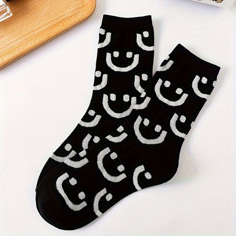5 Pairs Polyester Smiling Face Cartoon Men's Socks, Letter Striped Middle and Long Tube, Sweat Absorbing, All-match Adult