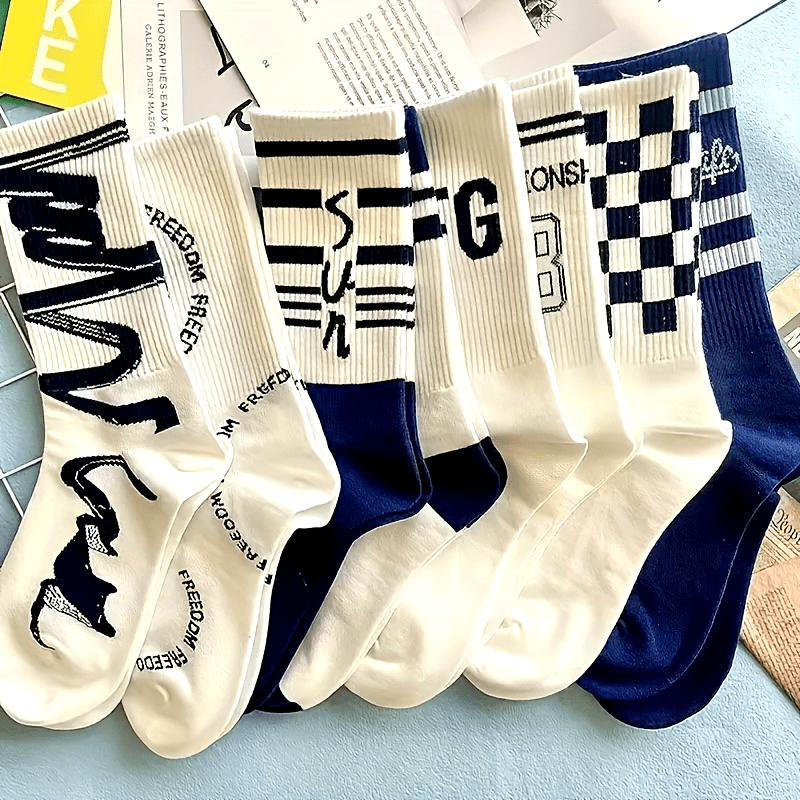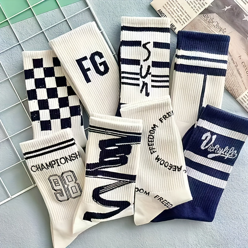 8-Pack Unisex Fashion Crew Socks, Polyester and Spandex Blend, Letter Print Knit Fabric, Hand Wash Only - Long Tube Socks for Men and Women