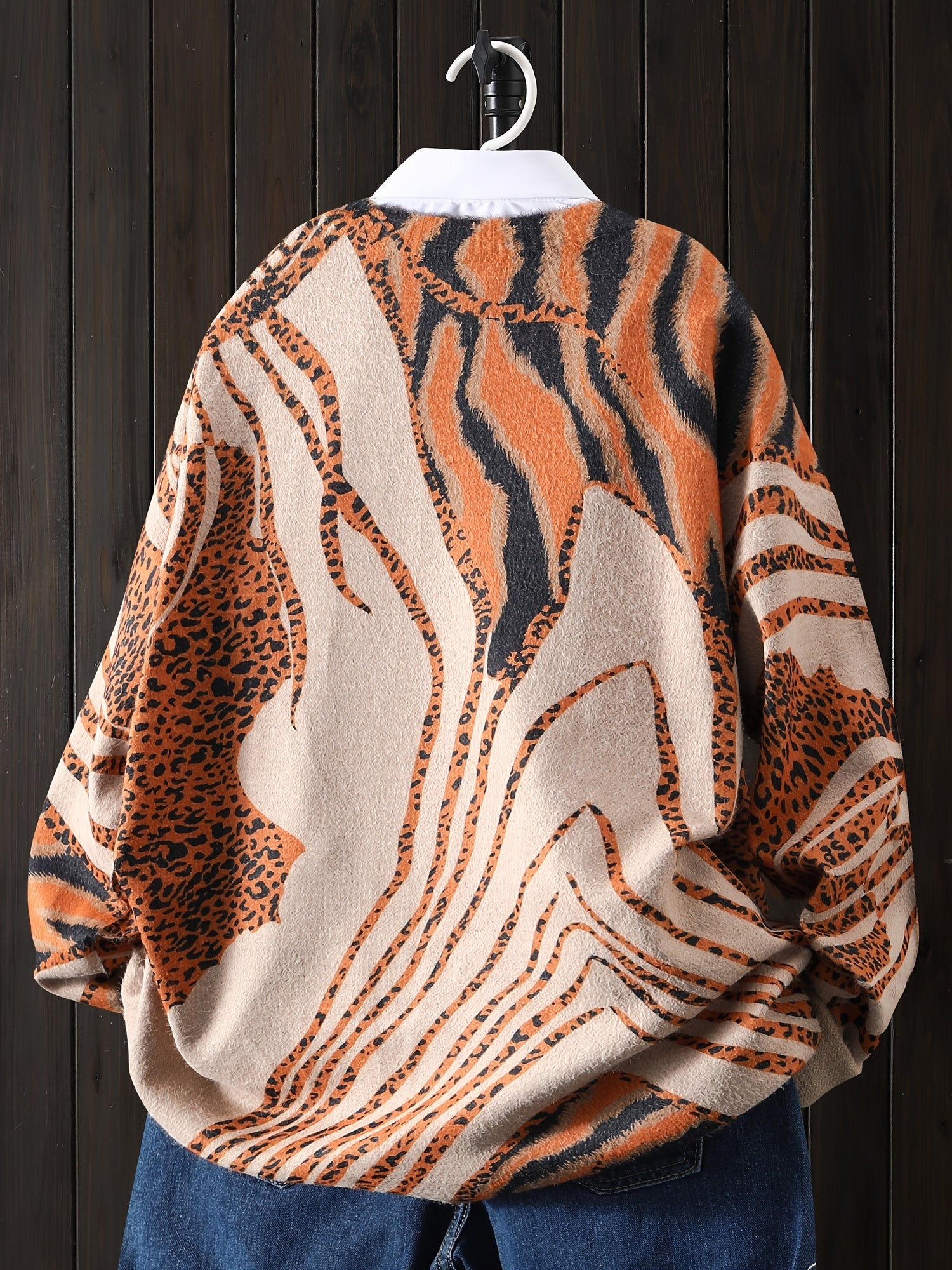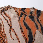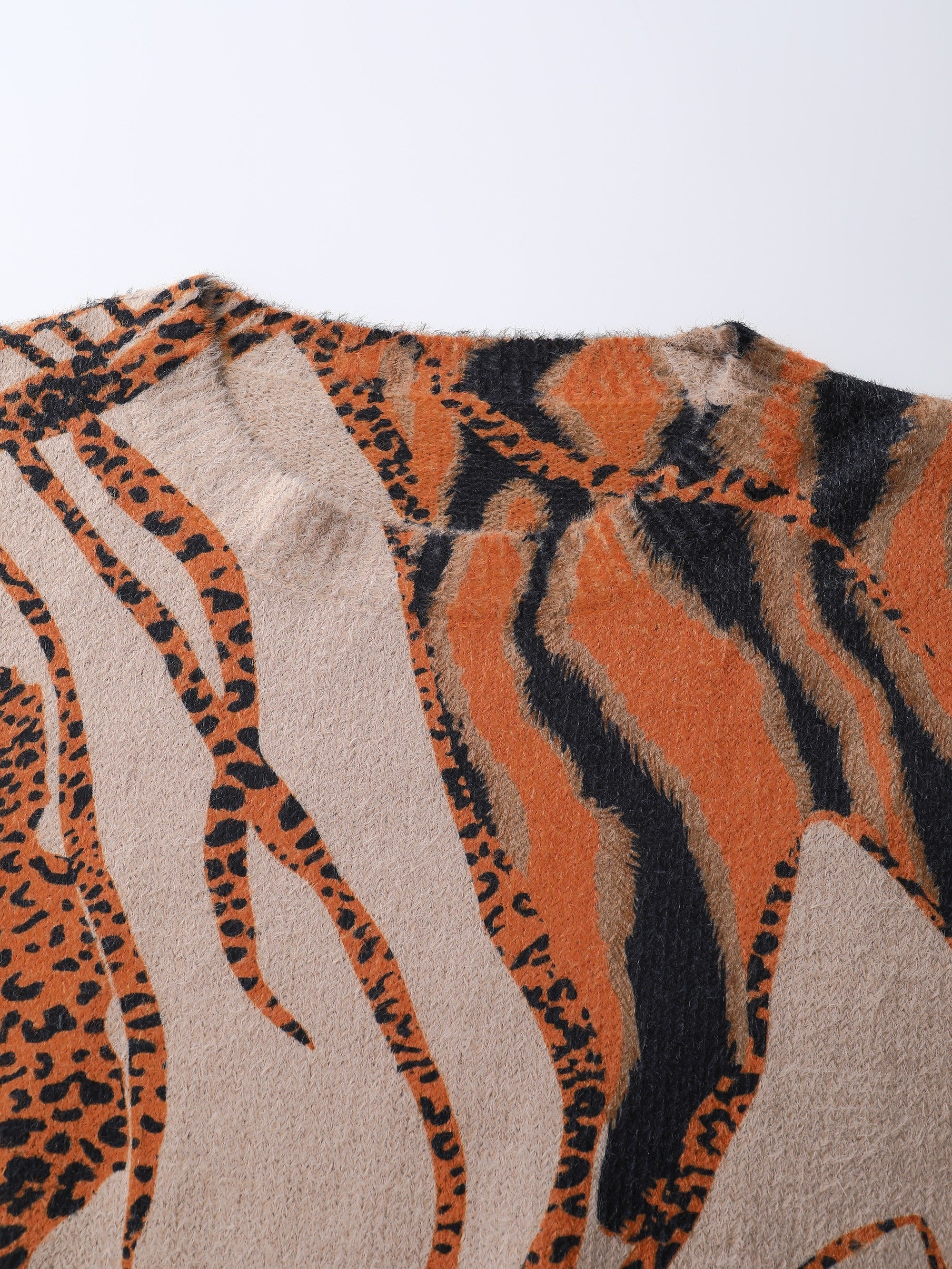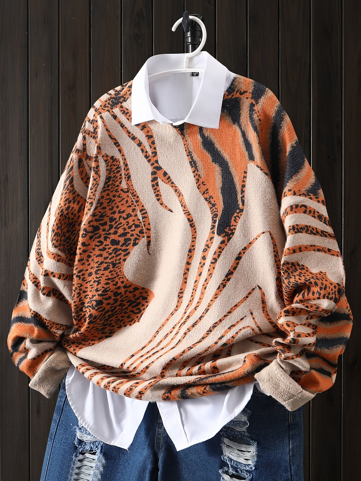 Women's Leopard Print Knitted Pullover Sweater - Geometric Pattern, Casual Round Neck, Long Sleeves, Stylish and Comfortable