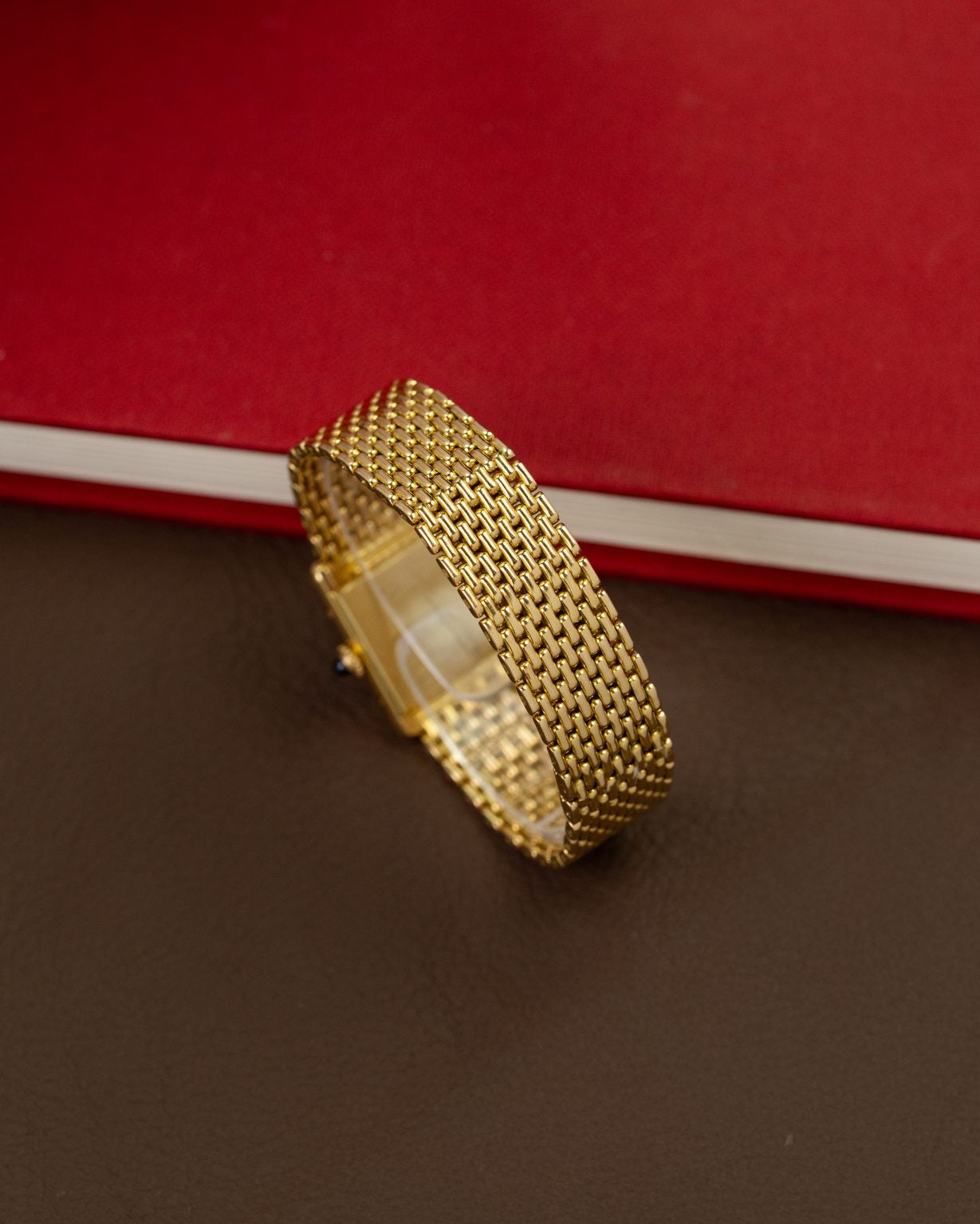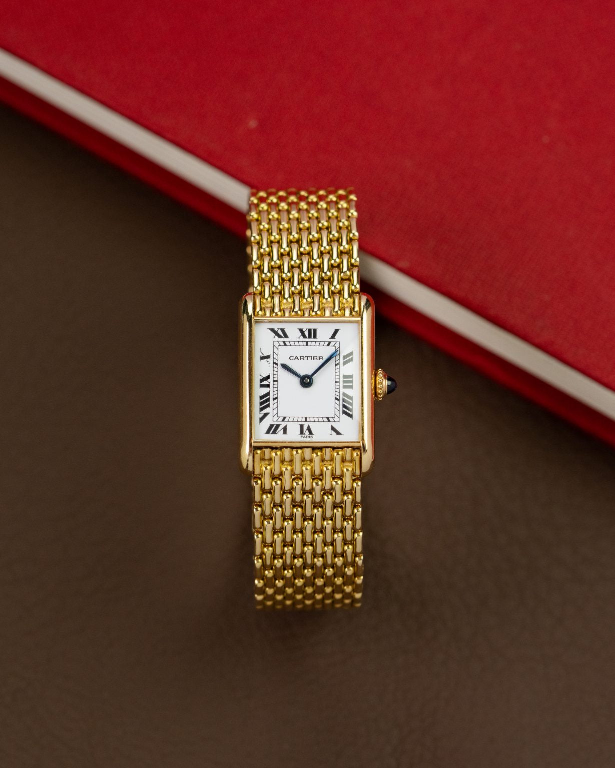 Le bracelet, également inspiré des chenilles de char, est en or jaune 18 carats avec boucle déployante. Le cadran blanc, épuré, arbore la signature « Paris » à 6 heures, symbole de raffinement et d’élégance Cartier.