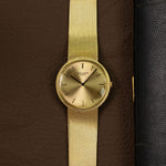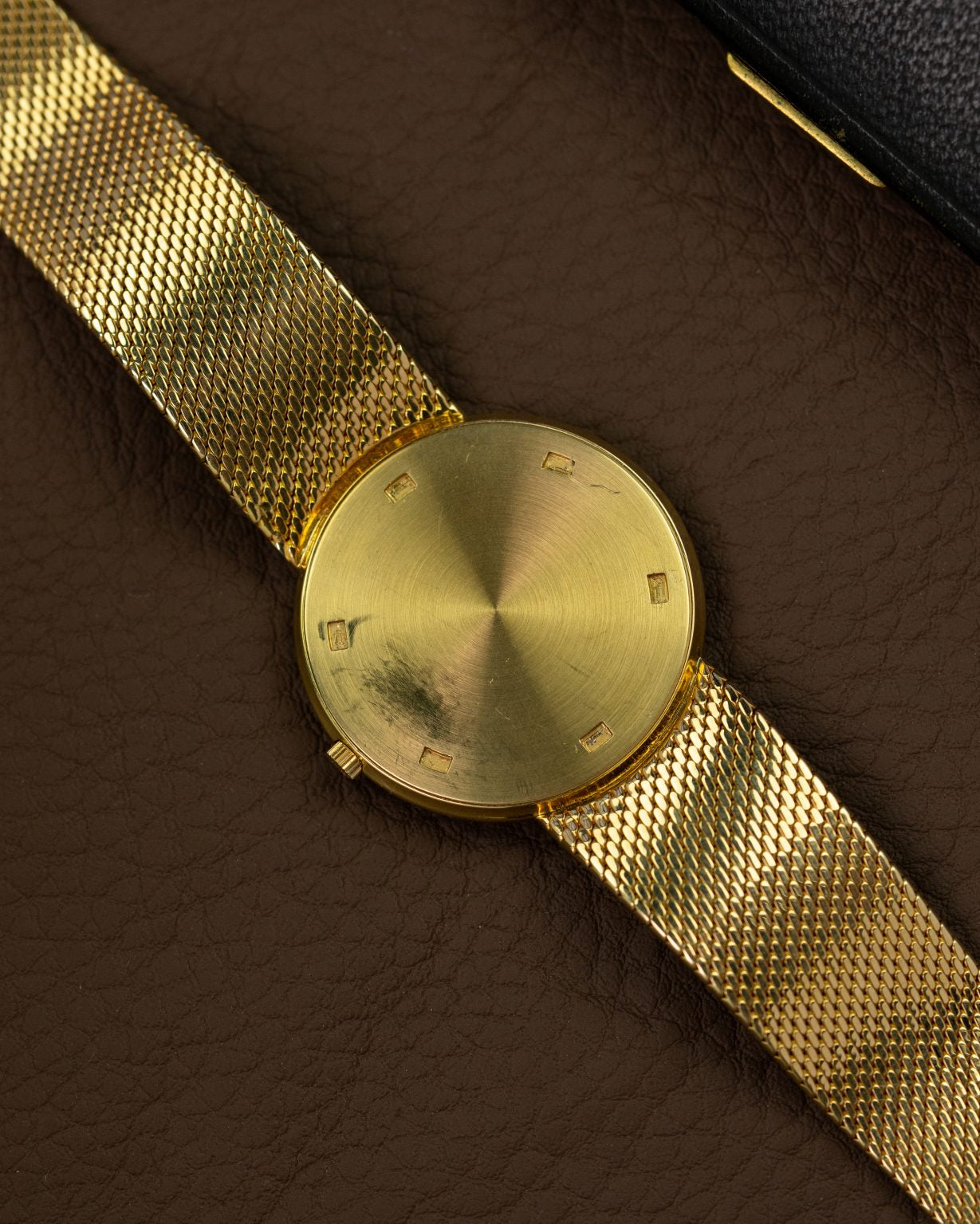 Ce qui rend ce modèle particulièrement exceptionnel est son bracelet intégré d’origine, également en or 18 carats. Conçu pour s’harmoniser parfaitement avec le boîtier, il confère à la montre une allure fluide et unifiée, se portant davantage comme un bijou raffiné qu’une montre traditionnelle.
