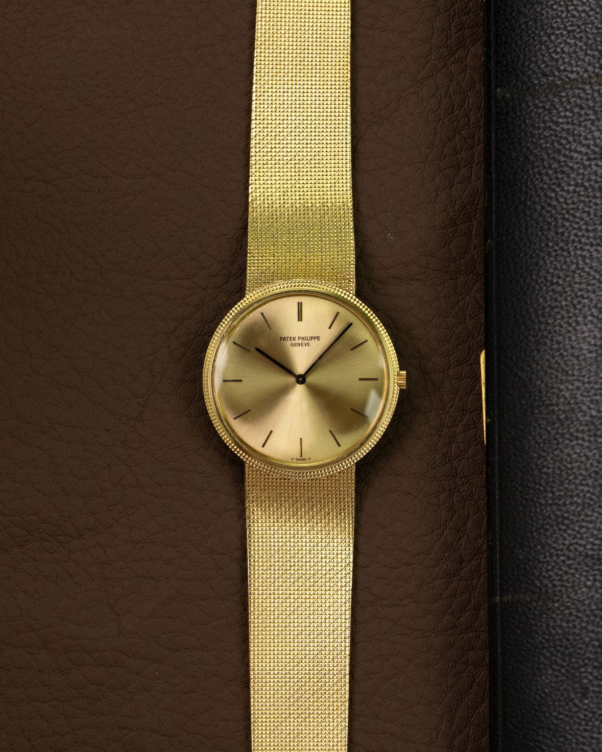 Cette Patek Philippe Calatrava Réf. 3520, introduite au début des années 1970, est la montre habillée par excellence. Son boîtier rond de 33 mm en or jaune 18 carats est sublimé par la lunette Clous de Paris, un motif décoratif qui apporte profondeur et raffinement tout en respectant les proportions classiques de la montre.
