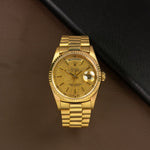 Cette pièce, référence 18238 de 1995, incarne l’élégance intemporelle. Son mouvement à double « quickset » permet d’ajuster jour et date séparément, un détail qui fait toute la différence pour les connaisseurs. Entièrement façonnée en or jaune 18 carats, elle se présente aujourd’hui dans un état remarquable, prête à écrire de nouveaux chapitres.