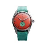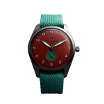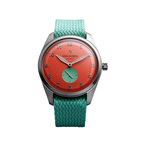 Étanche jusqu’à 50 mètres (5 ATM), elle est équipée d’un bracelet perlon Von Doren de 20 mm, avec le logo gravé sur la couronne et la boucle. Les aiguilles des heures et des minutes, ainsi que les chiffres, sont luminescents, offrant une lisibilité élégante en toutes circonstances.