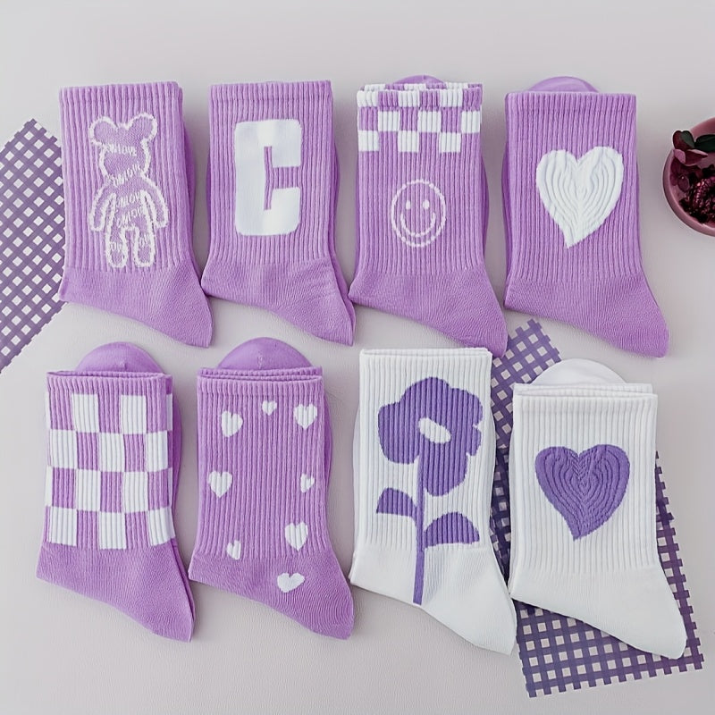 Discover this charming set of 8 pairs of mid-calf socks belonging to the Violet Series , decorated with various patterns such as bears, checkerboards, hearts, smileys and flowers . Ideal for adding an adorable and colorful touch to your casual outfits, they are also very comfortable thanks to their light and absorbent fabric.