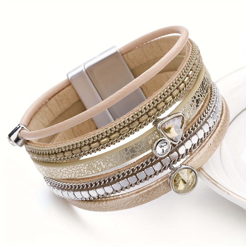 This PU leather bracelet, embellished with synthetic crystals, subtly combines classic style with a touch of originality. Its delicate shine and refined design make it an ideal piece of jewelry to brighten up your outfits, whether for everyday wear or for your most beautiful evenings.
