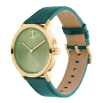 A tribute to modern design, combining boldness and refinement. This captivating model reveals a 40 mm case in pale gold-plated stainless steel, enhanced by a textured green dial covered in a glossy varnish. The refined details, such as the slim hands and the famous dot at 12 o'clock, are harmonised with a deep green leather strap with an elegant buckle closure.