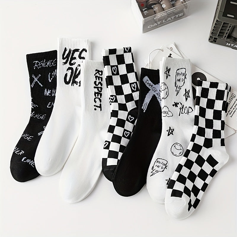 Discover this pack of 7 pairs of mid-calf socks with a black and white check (gingham) pattern , perfect for combining casual elegance and modern comfort . Inspired by current trends, these socks are ideal for light sports, city walks or to accessorize your everyday look.
