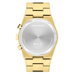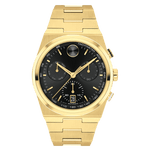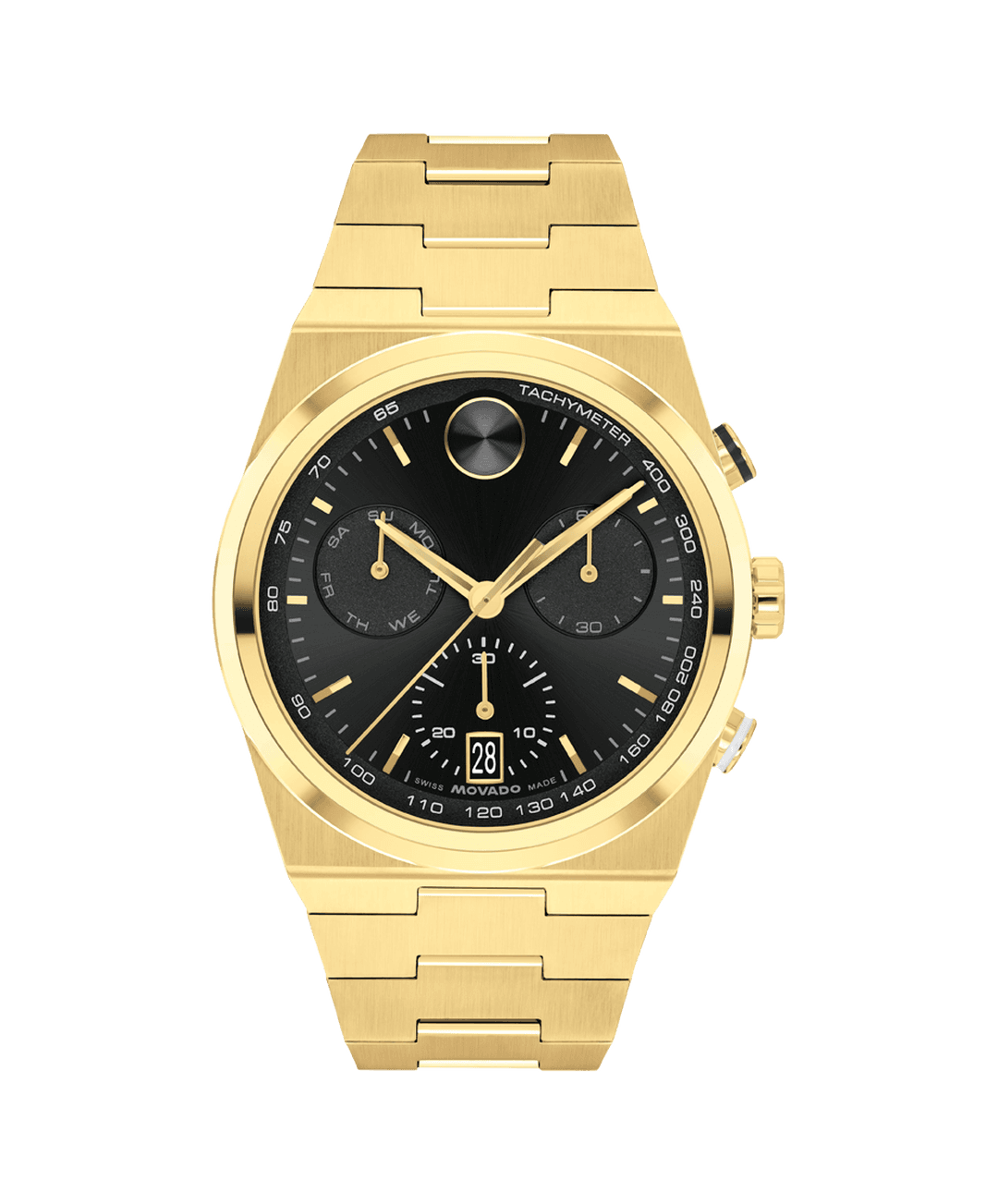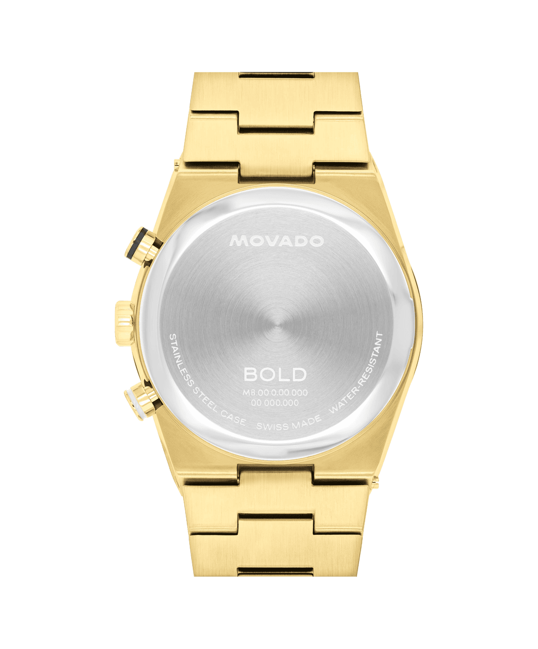The BOLD Quest Chronograph embodies a futuristic vision with its boldly shaped case and integrated bracelet. This 42 mm chronograph is distinguished by its black dial with satin-finished subdials, elegant yellow gold-tone hands and the iconic signature dot at 12 o’clock, symbolizing the collection’s timeless and modern style.