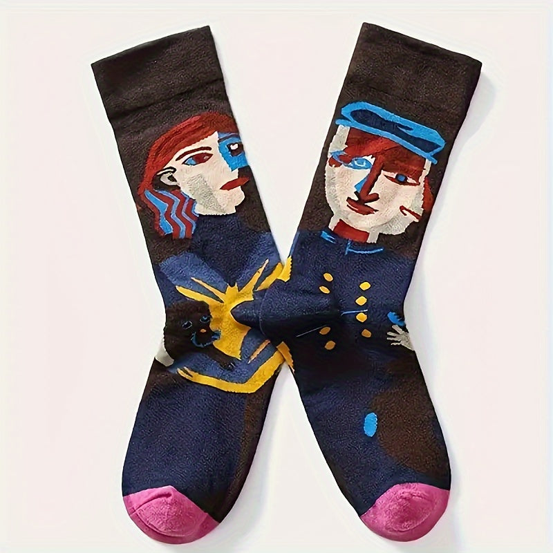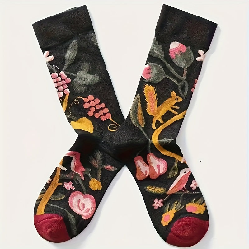 3 Pairs Artistic Oil Painting Print Socks - Creative Fashion Mid-Calf Socks with Unique Designs (Mona Lisa, Floral & Bird Motifs) - Unisex Couple Socks for Women & Men - Hand Wash Only, Novelty Socks