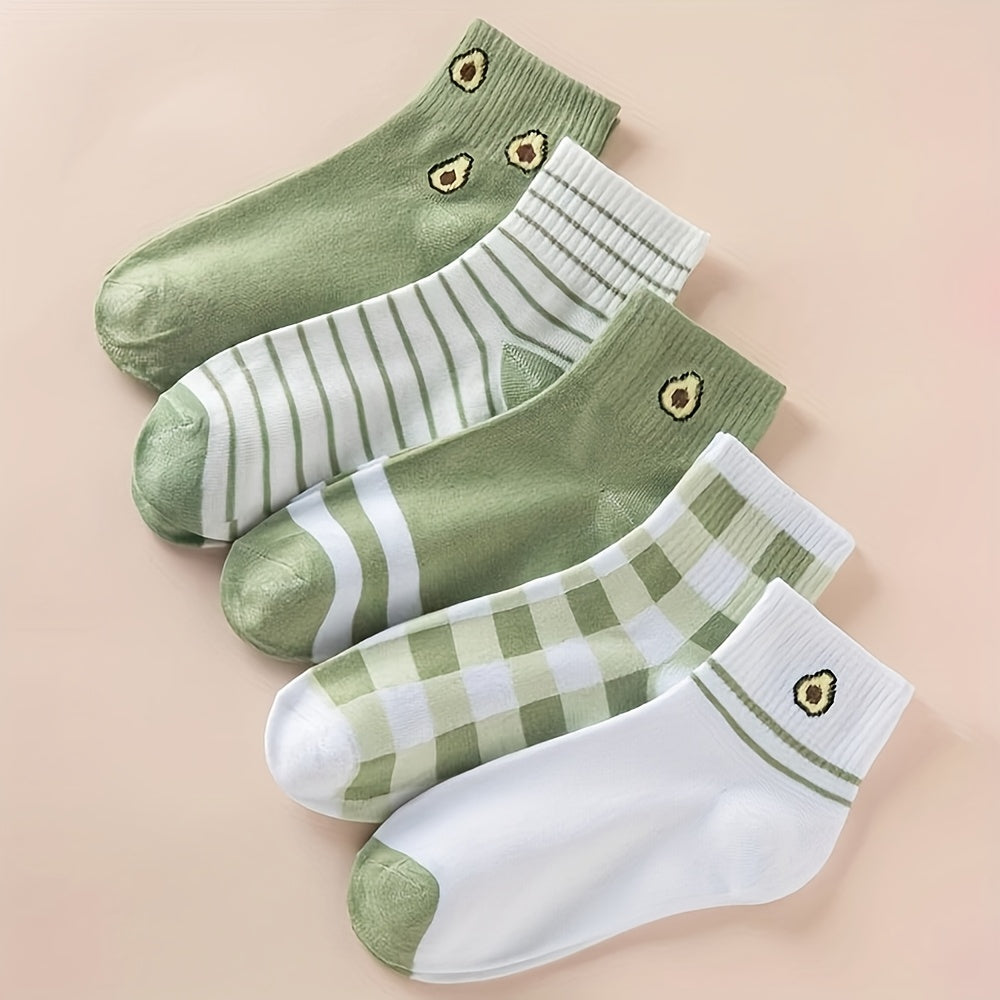 Discover this pack of 5 pairs of mid-calf socks decorated with trendy cartoon patterns , dominated by a charming avocado green that brings softness and modernity. Ideal for everyday wear, they combine simplicity, comfort and a touch of fantasy.