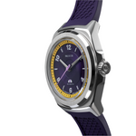 The purple dial, adorned with a tarmac-like texture and a subtle sunburst brushed effect, captures the light from every angle. The yellow chapter ring provides a striking contrast, while the indexes and numerals are coated with Super-LumiNova, ensuring perfect readability, even in the dark. The unique “cycling cap” detail at 6 o’clock pays homage to the spirit of cycling.