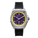 The purple dial, adorned with a tarmac-like texture and a subtle sunburst brushed effect, captures the light from every angle. The yellow chapter ring provides a striking contrast, while the indexes and numerals are coated with Super-LumiNova, ensuring perfect readability, even in the dark. The unique “cycling cap” detail at 6 o’clock pays homage to the spirit of cycling.