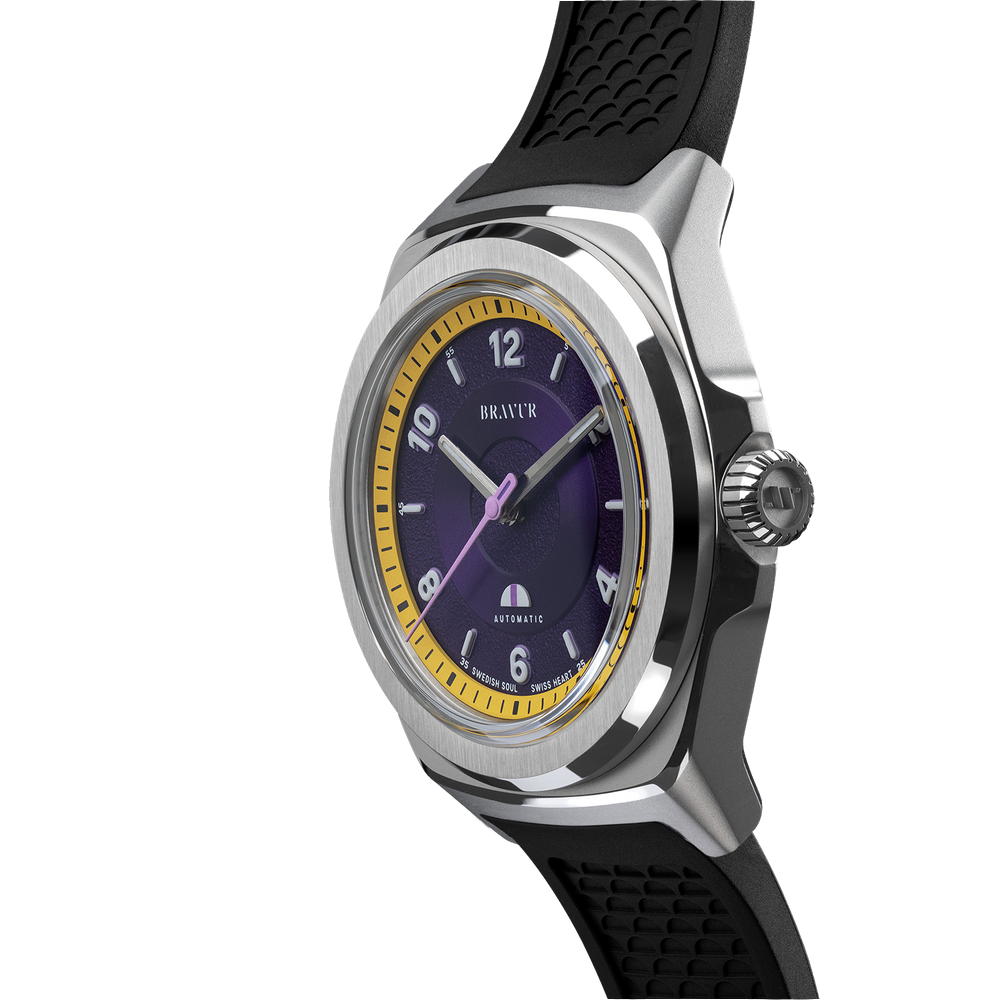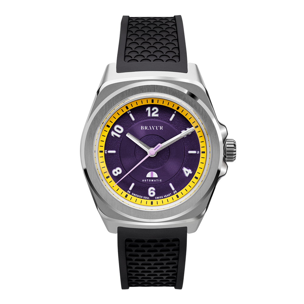 Discover a bold and distinctive watch, where sporty design and Swedish craftsmanship meet. With a 37 mm diameter and 44.6 mm lug-to-lug 316L stainless steel case, it offers optimal comfort and versatile style. The screw-down crown ensures reliable water resistance, while the 18 mm lugs allow the watch to be personalized with an FKM rubber or leather strap.