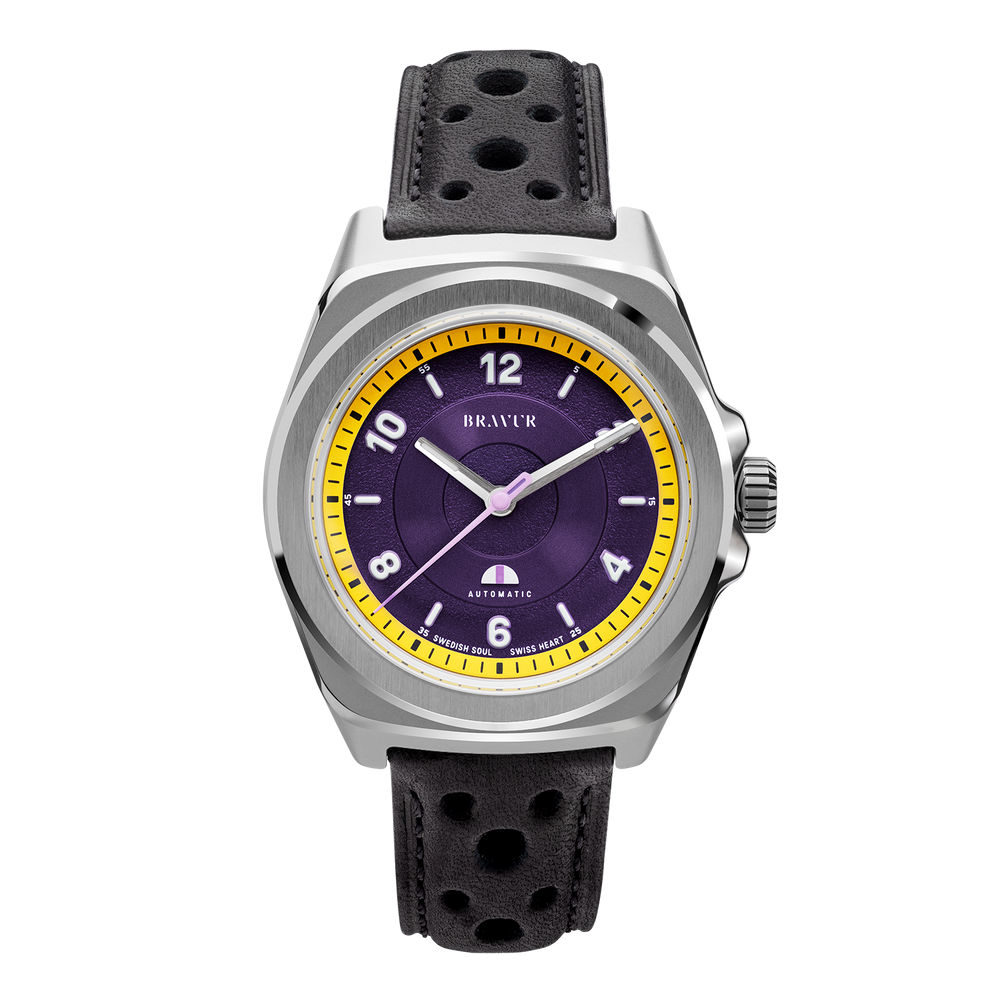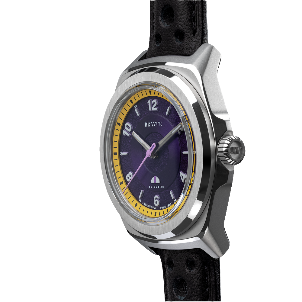 Discover a bold and distinctive watch, where sporty design and Swedish craftsmanship meet. With a 37 mm diameter and 44.6 mm lug-to-lug 316L stainless steel case, it offers optimal comfort and versatile style. The screw-down crown ensures reliable water resistance, while the 18 mm lugs allow the watch to be personalized with an FKM rubber or leather strap.