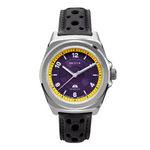 The purple dial, adorned with a tarmac-like texture and a subtle sunburst brushed effect, captures the light from every angle. The yellow chapter ring provides a striking contrast, while the indexes and numerals are coated with Super-LumiNova, ensuring perfect readability, even in the dark. The unique “cycling cap” detail at 6 o’clock pays homage to the spirit of cycling.