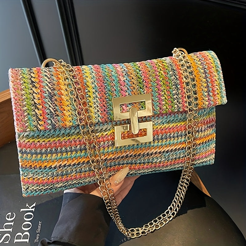 New Trend Fashion Women Single Shoulder Bag, Colorful Striped Pattern, Bohemian Style Multi-Compartment Woven Straw with Chain Strap, Cross-Body Bag, Favorite Classic Square Handbag, Summer Vacation Beach Bag, Crazy Bag