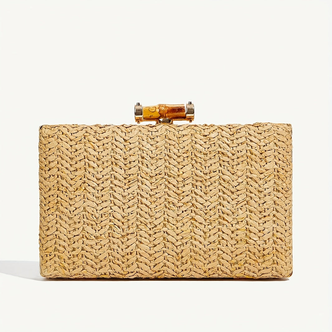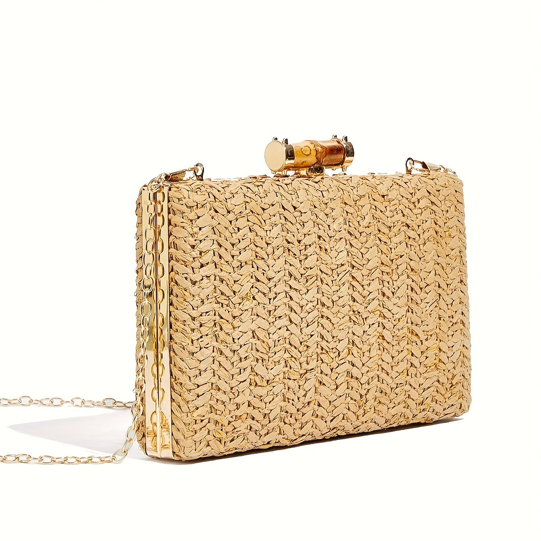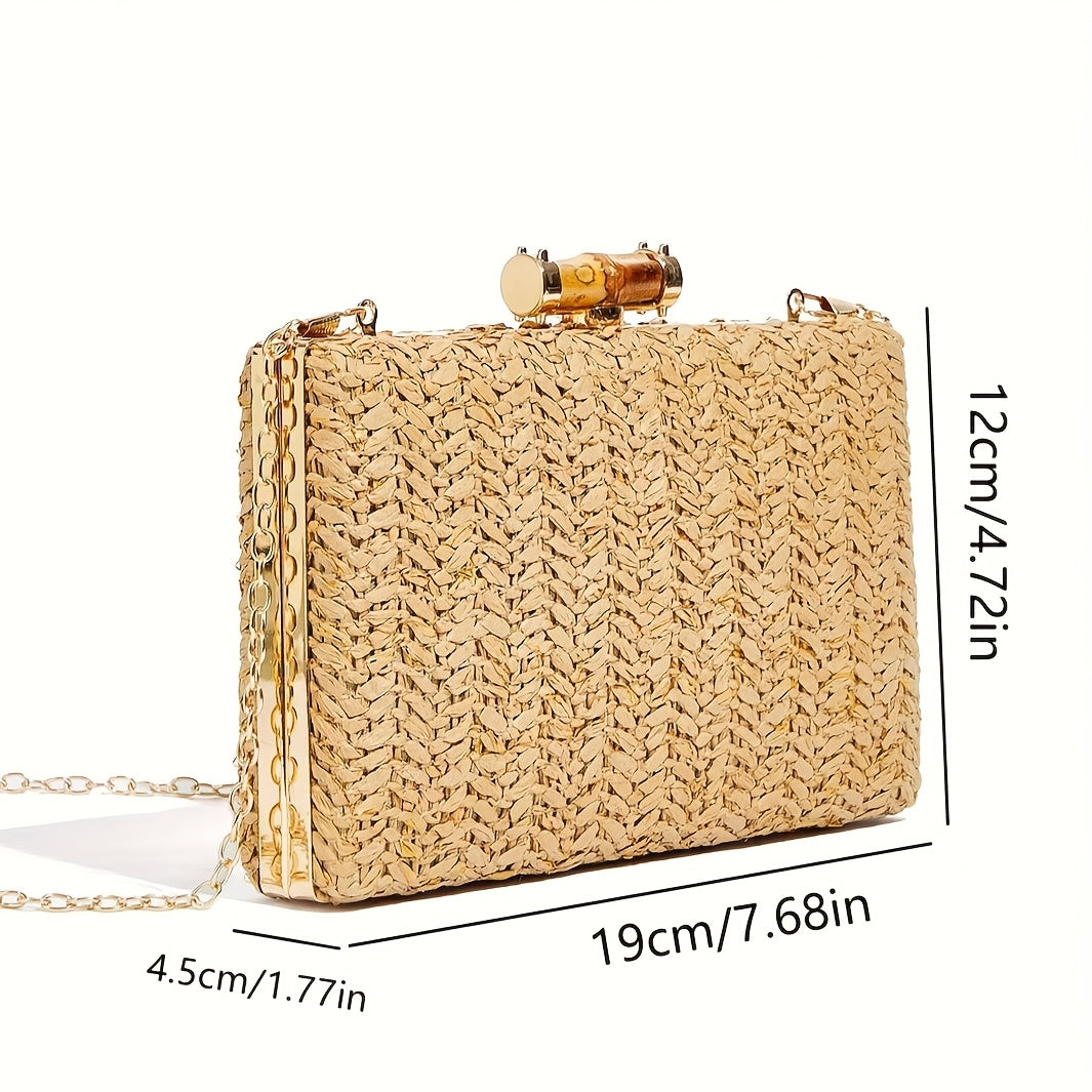 Clutch en Forme de Bambou à Tissage d'Herbe avec Fil Doré Scintillant pour Femmes, Chaîne Métallique Détachable et Bandoulière Crossbody, Idéal pour Vacances, Voyages, Plage, Pique-niques, Fêtes Extérieures, Mariages Thématiques, Cadeaux de Vacances